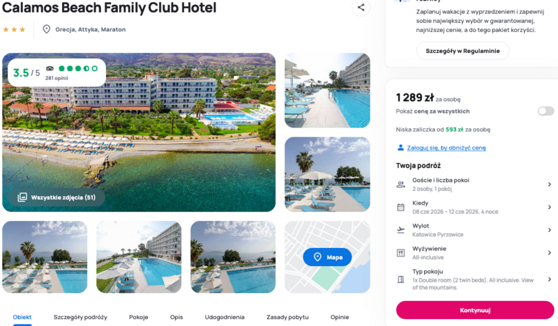 Oferta wydaje się bardzo korzystna, zwłaszcza biorąc pod uwagę pakiet all inclusive i wygodne warunki zakwaterowania. Calamos Beach Family Club Hotel może być dobrą opcją zarówno dla rodzin z dziećmi, jak i dla par, które chcą spędzić czas w spokojnym otoczeniu, ciesząc się greckimi smakami i widokami.