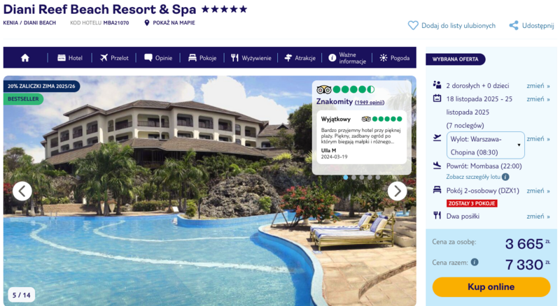 Południowe wybrzeże Kenii, a szczególnie Diani Beach, to miejsce, które potrafi oczarować od pierwszego wejrzenia. Zachwyca tutejsza przyroda, szerokie, piaszczyste plaże i klimat, który aż się prosi o relaks. Osoby, które miały już okazję odwiedzić ten region, często podkreślają, że to jedno z tych miejsc, do których chce się wracać. Sam Diani Reef Beach Resort & Spa cieszy się bardzo dobrymi opiniami – doceniany jest za wysoki standard obsługi, ciekawe animacje, zadbane tereny i egzotycznych gości w ogrodzie – można tu spotkać nie tylko barwne jaszczurki, ale też zwinne małpy.