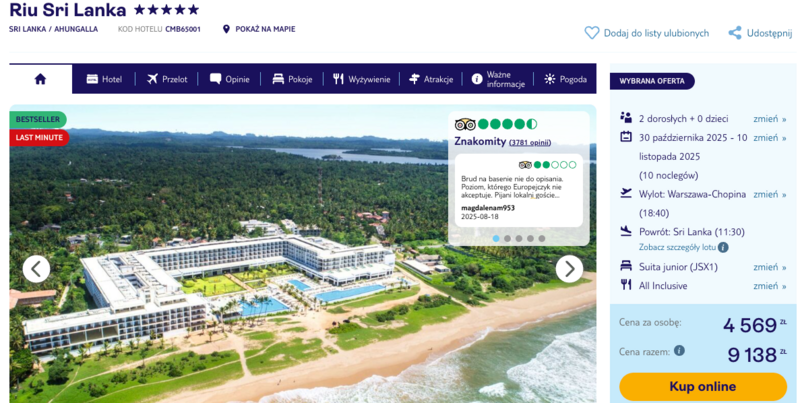 Wylot z Warszawy-Chopina do Sri Lanki zapowiada się naprawdę obiecująco – celem podróży jest hotel Riu Sri Lanka, który zachwyca pięcioma gwiazdkami i lokalizacją tuż przy piaszczystej plaży w urokliwej miejscowości Ahungalla.