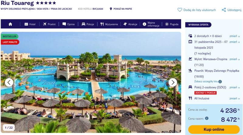 Na miejscu czeka hotel Riu Touareg, miejsce, które zbiera wiele pochlebnych opinii. Otoczony zielenią i położony tuż przy plaży, oferuje nie tylko wygodne pokoje, ale też rozbudowany kompleks basenów i spory wybór aktywności – od sportów wodnych po relaks w strefie wellness. Goście szczególnie doceniają dbałość o czystość, przyjazną obsługę oraz menu, które zachwyca różnorodnością smaków – od dań kuchni międzynarodowej, przez świeże owoce, aż po lokalne specjały. A wszystko to w formule all inclusive.