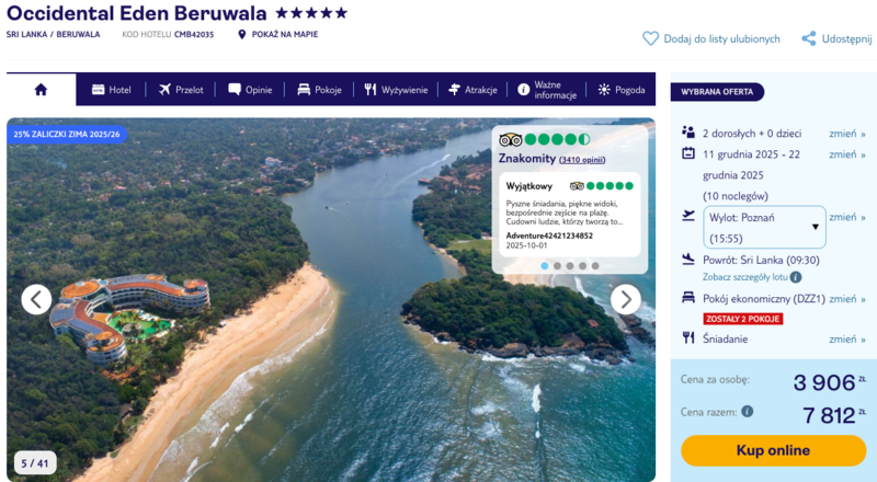 Hotel Occidental Eden Beruwala to miejsce, które łączy wygodę z egzotycznym klimatem. Położony tuż przy plaży, na zachodnim wybrzeżu Sri Lanki, gwarantuje widoki jak z pocztówki i łatwy dostęp do oceanu. Goście chwalą sobie nie tylko czystość i komfort, ale też wyjątkowo uprzejmą obsługę. W obiekcie znajdziesz zewnętrzny basen, strefę spa i kilka restauracji – od kuchni lokalnej po europejskie smaki.