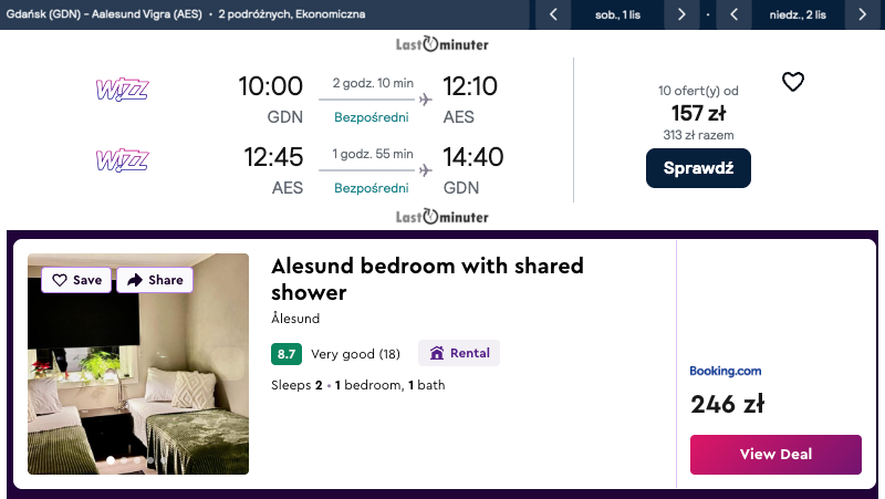 Loty z Gdańska do Aalesund to świetna opcja dla tych, którzy lubią podróżować wygodnie i nie przepłacać. Bezpośrednie połączenie w dobrej cenie i z czasem przelotu około 2 godzin i 10 minut brzmi naprawdę kusząco. Powrót do Gdańska zajmuje jeszcze mniej czasu, więc całość wypada bardzo korzystnie, zwłaszcza jeśli zależy nam na efektywnym wykorzystaniu dni wolnych, bez długiego siedzenia w samolocie.