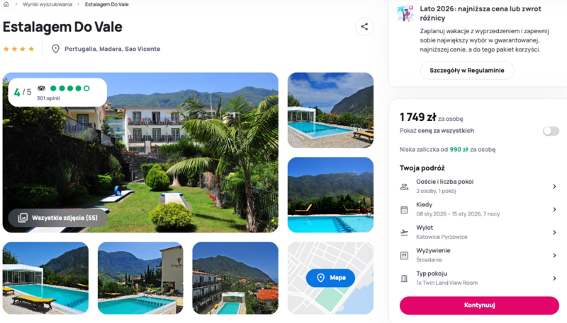 Loty z Katowic, Berlina, Gdańska, Krakowa, Warszawy, Wrocławia i Poznania na Maderę to świetna okazja na urlop z dala od codziennego zgiełku. Na miejscu można zatrzymać się w 4-gwiazdkowym hotelu Estalagem Do Vale, położonym w urokliwym São Vicente, w otoczeniu bujnej zieleni i górskich krajobrazów. Hotel oferuje wygodne pokoje oraz udogodnienia, które ucieszą zarówno dorosłych, jak i dzieci.