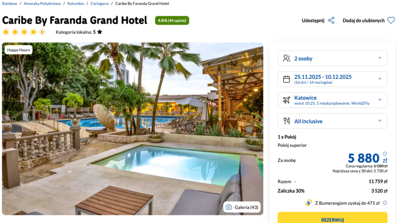 Długi wypoczynek w Kolumbii: 14 dni w 5* hotelu z all inclusive za 5880 zł
