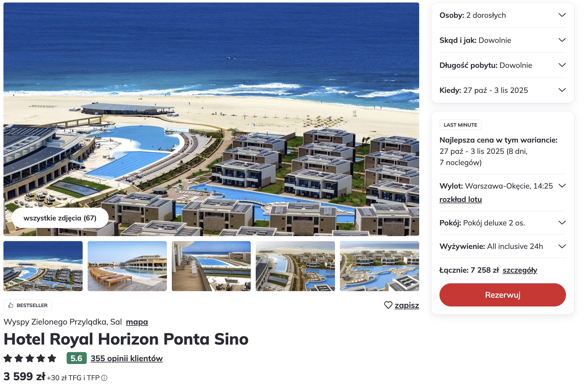 Na miejscu czeka komfortowy, pięciogwiazdkowy hotel Royal Horizon Ponta Sino, który zbiera sporo pozytywnych opinii od odwiedzających. Goście szczególnie chwalą przestronne, nowoczesne pokoje, regularnie sprzątane i wyposażone we wszystko, co potrzebne do wygodnego pobytu. Obiekt został otwarty w czerwcu 2025 roku, więc wszystko jest świeże, nowoczesne i zadbane. Do dyspozycji są aż trzy baseny, animacje, miniklub dla dzieci i wiele innych atrakcji – ciekawa propozycja zarówno dla rodzin, jak i par szukających odpoczynku w dobrym stylu.