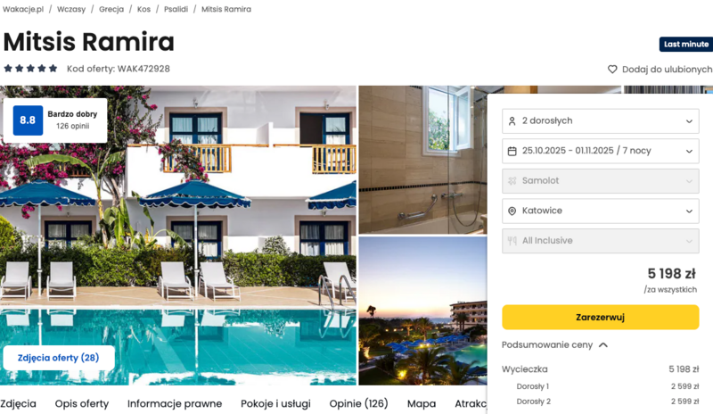 Oferta pobytu w Mitsis Ramira łączy w sobie komfort, dobrą lokalizację i różnorodność atrakcji. Jest to pomysł zarówno na rodzinny wypoczynek, jak i romantyczny wyjazd we dwoje. To dobry moment, by złapać ostatnie promienie słońca przed zimą i poznać Grecję od tej spokojniejszej, jesiennej strony.