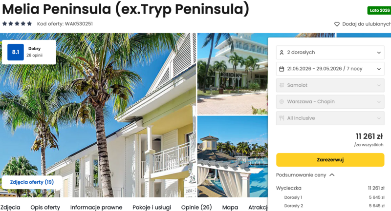 Wylatując z Warszawy-Chopin prosto do Varadero, można zafundować sobie solidną dawkę relaksu w egzotycznym klimacie. W programie pobyt w pięciogwiazdkowym hotelu Melia Peninsula (dawniej znanym jako Tryp Peninsula), który zachęca nie tylko komfortem, ale i pięknym, karaibskim otoczeniem.