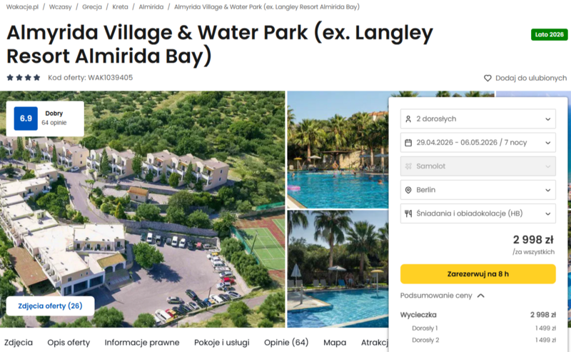 Wyjazd do Almyrida Village & Water Park to dobra opcja dla tych, którzy szukają udanego wypoczynku w rozsądnej cenie. Połączenie pięknej lokalizacji, przyjemnego klimatu i greckiego uroku sprawia, że można tu naprawdę odpocząć – zarówno od pracy, jak i od pośpiechu dnia codziennego. Kreta to miejsce, które łączy relaks z możliwością odkrywania niezwykłej historii i kultury.