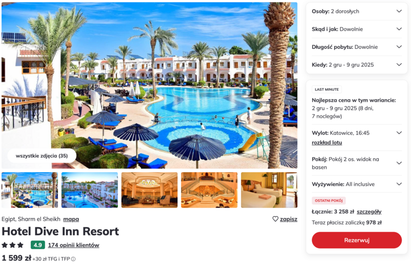 Wylot do Sharm el Sheikh z Katowic i Warszawy zaplanowano na początek grudnia 2025 roku. W planach – pobyt w trzygwiazdkowym hotelu Dive Inn Resort, który cieszy się dobrymi opiniami podróżnych.