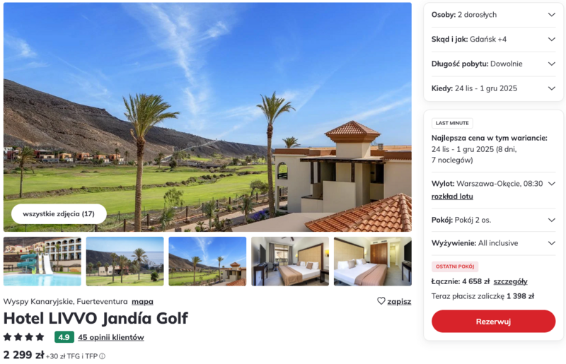 Na miejscu czeka hotel LIVVO Jandía Golf, który świetnie sprawdzi się dla osób szukających relaksu, wygody i dobrego jedzenia. Duże, wygodne pokoje, przestrzeń do wypoczynku i formuła all inclusive sprawiają, że można skupić się wyłącznie na przyjemnościach. Hotel znajduje się w urokliwej okolicy, niedaleko pola golfowego, co z pewnością docenią fani tego sportu. Są też dwa baseny – w tym jeden z podgrzewaną wodą – oraz strefa wodnej zabawy dla najmłodszych.