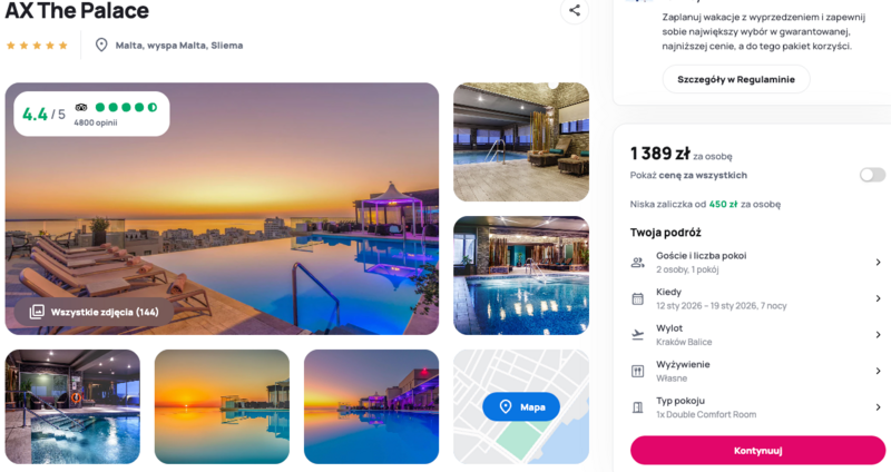 Cała oferta łączy w sobie komfort wypoczynku i możliwość odkrywania jednej z najbardziej fascynujących wysp na Morzu Śródziemnym. Niezależnie od tego, czy planujesz aktywne zwiedzanie, czy spokojniejsze chwile z widokiem na morze – AX The Palace może okazać się idealnym wyborem na podróż.