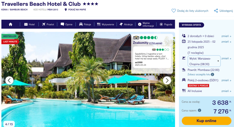 Wyloty z Warszawy i Katowic do słonecznej Kenii. Uczestnicy spędzą ten tydzień w Travellers Beach Hotel & Club, który oferuje wygodną formułę all inclusive, idealną na pełen relaks.