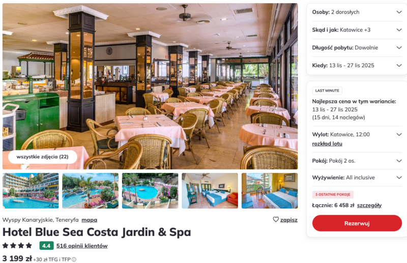 Wylot z Katowic na Teneryfę to świetna okazja, by na chwilę oderwać się od codzienności i zanurzyć się w hiszpańskim klimacie. Na miejscu czeka 4-gwiazdkowy Hotel Blue Sea Costa Jardin & Spa, który zapewnia komfortowy wypoczynek w naprawdę malowniczej scenerii – są tu nie tylko widoki na ocean, ale i zapierający dech w piersiach wulkan Teide.