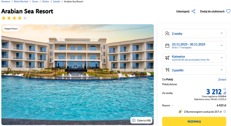 Cała oferta obejmuje przelot i transfery, co sprawia, że podróż przebiega bez stresu i pozwala w pełni korzystać z uroków Omanu. W porównaniu z innymi kierunkami to naprawdę konkurencyjna opcja, szczególnie jeśli szukasz czegoś niecodziennego, ale komfortowego.
