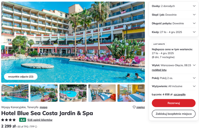Listopad to świetny moment na odwiedziny – temperatury w okolicach 26°C pozwalają na swobodne plażowanie i zwiedzanie bez upałów. Połączenie lotu, pobytu w wygodnym hotelu i opcji all inclusive czyni tę ofertę naprawdę atrakcyjnym wyborem. Teneryfa potrafi zauroczyć – szczególnie tych, którzy marzą o odrobinie lata, gdy w Polsce robi się coraz chłodniej.