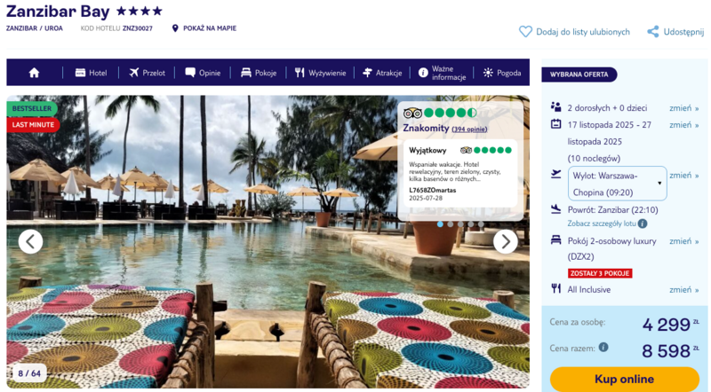 Cała oferta prezentuje się bardzo atrakcyjnie – zarówno pod względem usług w pakiecie, jak i samego położenia hotelu. Zanzibar Bay to nie tylko wygodne miejsce na pobyt, ale też świetna baza do odkrywania uroków tej niezwykłej wyspy.