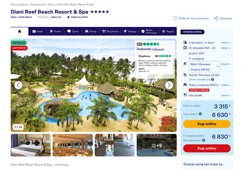 Wylot z Warszawy-Chopina zapowiada się jako początek wyjątkowej przygody w Kenii. Na miejscu czeka Diani Reef Beach Resort & Spa – hotel położony tuż przy jednej z najpiękniejszych plaż w tej części Afryki. Miejsce to cieszy się świetną opinią wśród odwiedzających, którzy chwalą nie tylko czystość i komfort, ale też gościnną atmosferę i profesjonalną obsługę.
