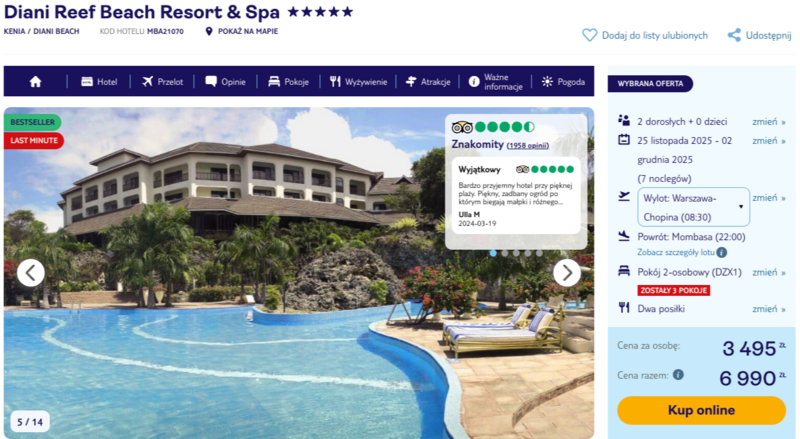 Wylot z Warszawy-Chopina zapowiada się jako początek wyjątkowej przygody w Kenii. Na miejscu czeka Diani Reef Beach Resort & Spa – hotel położony tuż przy jednej z najpiękniejszych plaż w tej części Afryki. Miejsce to cieszy się świetną opinią wśród odwiedzających, którzy chwalą nie tylko czystość i komfort, ale też gościnną atmosferę i profesjonalną obsługę.