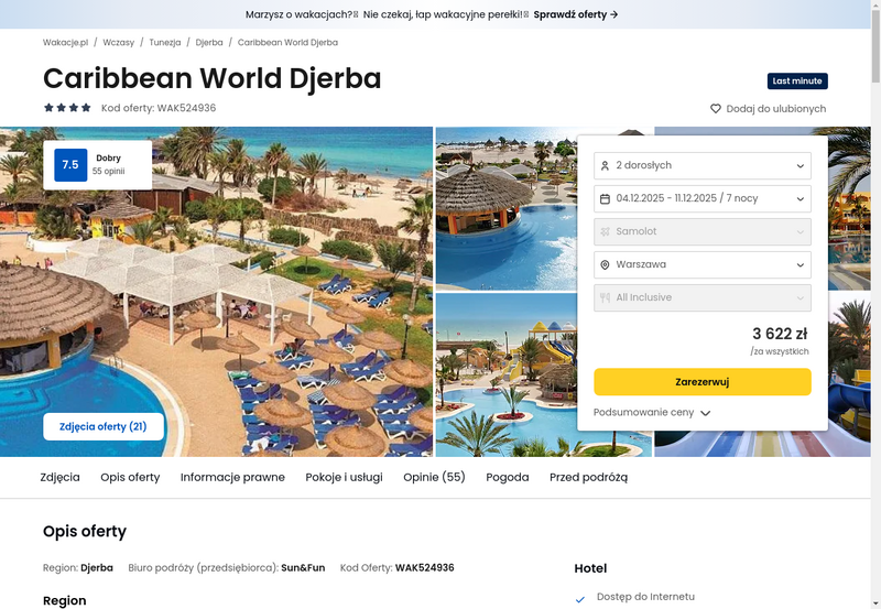 Misją Lastminuter.pl jest przedstawienie Ci najlepszych zdaniem naszej redakcji okazji na podróże. Opisujemy oferty znalezione przez nas w internecie i wskazujemy adresy internetowe, pod którymi samodzielnie możesz wykupić podróż lub elementy podróży. Ceny w artykułach są aktualne w chwili publikacji. Możemy otrzymywać wynagrodzenie od partnerów handlowych, do których Cię przekierowujemy. Nie ma to wpływu na cenę Twojej wycieczki. Powielanie publikacji zabronione.