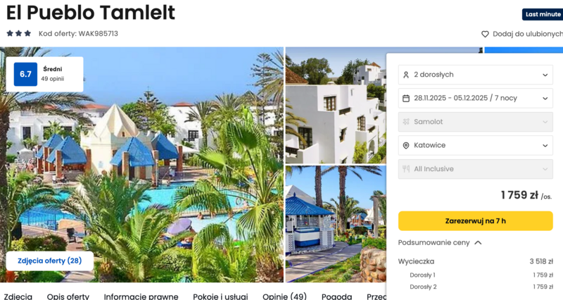 Hotel El Pueblo Tamlelt, w którym przewidziane jest zakwaterowanie, położony jest niedaleko szerokiej, piaszczystej plaży i tętniącego życiem centrum Agadiru. To trzygwiazdkowy obiekt, który w formule all inclusive oferuje spory komfort – dostęp do posiłków i lokalnych napojów bez ograniczeń na pewno pozwala wypoczywać bez stresu. Goście chwalą hotel za czyste pokoje, miłą obsługę i atmosferę, która zachęca do relaksu. Dodatkowo na miejscu nie brakuje animacji i atrakcji zarówno dla dorosłych, jak i dzieci.