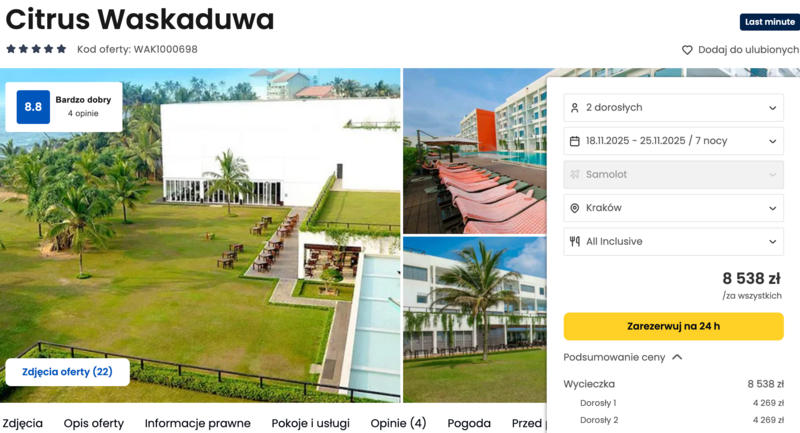 Wylot z Krakowa, Poznana i i Warszawy to świetna okazja, żeby oderwać się od codzienności i zanurzyć w egzotycznym klimacie. Hotel Citrus Waskaduwa, położony na zachodnim wybrzeżu wyspy, to miejsce stworzone z myślą o pełnym relaksie – tutaj można korzystać z opcji all inclusive i po prostu cieszyć się urlopem bez zmartwień.