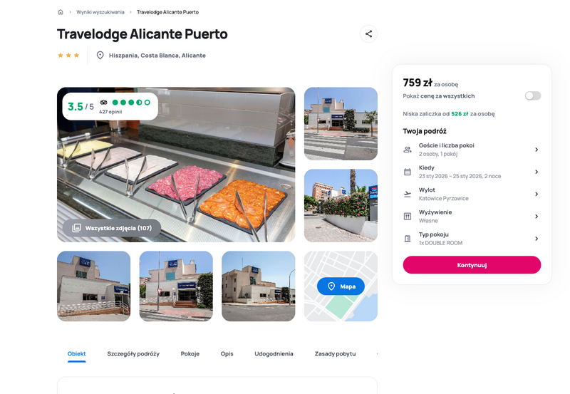 Na miejscu czeka na Was Travelodge Alicante Puerto – hotel położony w centrum miasta, idealny dla tych, którzy chcą mieć wszystko w zasięgu spaceru. Port, popularne centrum handlowe El Corte Ingles czy plaża Postiguet są tuż obok. Blisko też do miejsc jak Teatr Główny czy Katedra San Nicolas. To dobra baza wypadowa zarówno na leniwe spacery po urokliwych uliczkach, jak i na bardziej intensywne zwiedzanie.
