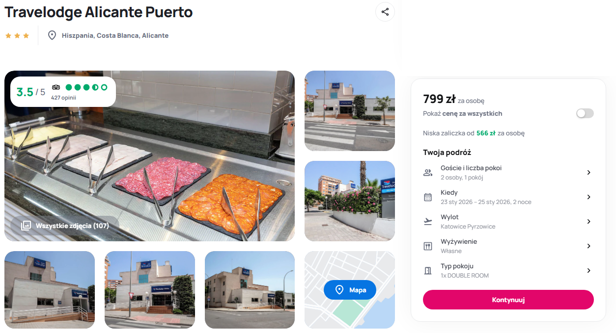 Na miejscu czeka na Was Travelodge Alicante Puerto – hotel położony w centrum miasta, idealny dla tych, którzy chcą mieć wszystko w zasięgu spaceru. Port, popularne centrum handlowe El Corte Ingles czy plaża Postiguet są tuż obok. Blisko też do miejsc jak Teatr Główny czy Katedra San Nicolas. To dobra baza wypadowa zarówno na leniwe spacery po urokliwych uliczkach, jak i na bardziej intensywne zwiedzanie.