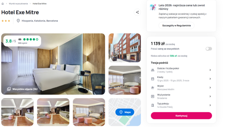 Zatrzymasz się w 3* hotelu Exe Mitre, położonym w spokojnej okolicy Sarrià-Sant Gervasi. To przyjemne miejsce z wygodnymi pokojami, bezpłatnym Wi-Fi i śniadaniem w formie bufetu. Blisko stąd do metra (stacja Putxet), co ułatwia szybkie i wygodne poruszanie się po całym mieście. Goście często chwalą hotel za miłą obsługę i dobrą jakość usług – to idealna baza wypadowa na miejskie wędrówki.