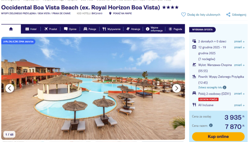 Pobyt w Occidental Boa Vista Beach (wcześniej znanym jako Royal Horizon Boa Vista) to połączenie wygody i egzotycznych wrażeń. Ten 4* hotel cieszy się świetnymi opiniami gości, którzy chwalą sobie jego położenie tuż przy plaży, serdeczną obsługę i kompleksową ofertę all inclusive. Na miejscu czekają przyjemnie urządzone pokoje, smaczne i urozmaicone posiłki oraz bogaty program animacyjny – niezależnie od tego, czy stale chcesz być w ruchu, czy po prostu odpocząć.