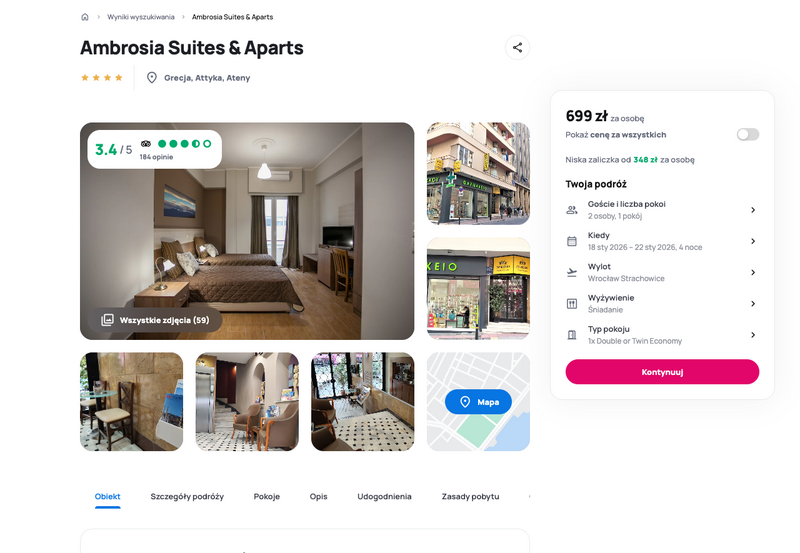 Cena całego wyjazdu wypada bardzo korzystnie, zwłaszcza biorąc pod uwagę lokalizację hotelu i jego dobry standard. 4* Ambrosia Suites & Aparts oferuje wygodne zakwaterowanie i wszystkie niezbędne udogodnienia, co czyni tę propozycję ciekawym pomysłem na krótką, ale pełną wrażeń podróż. Idealna okazja, by połączyć poznawanie greckiej kultury z chwilą relaksu w klimatycznym otoczeniu.