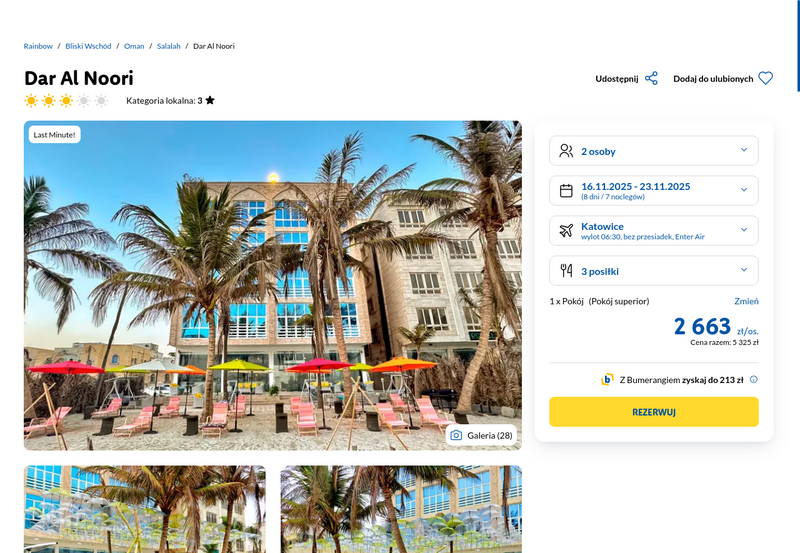 Wyloty z Katowic i Warszawy a kierunek – Oman, a dokładniej Salala, gdzie czeka trzygwiazdkowy hotel Dar Al Noori. Obiekt położony jest blisko plaży, z widokiem na Morze Arabskie i w spokojnej okolicy, co sprzyja wypoczynkowi. Goście mają do dyspozycji bufetowe wyżywienie z trzema posiłkami dziennie – w menu dominują dania kuchni międzynarodowej, a wszystko serwowane jest w restauracji Sea Sunrise. Kameralna atmosfera hotelu i bezpośredni dostęp do piaszczystej plaży z leżakami i parasolami to coś, co wielu podróżnych szczególnie docenia.