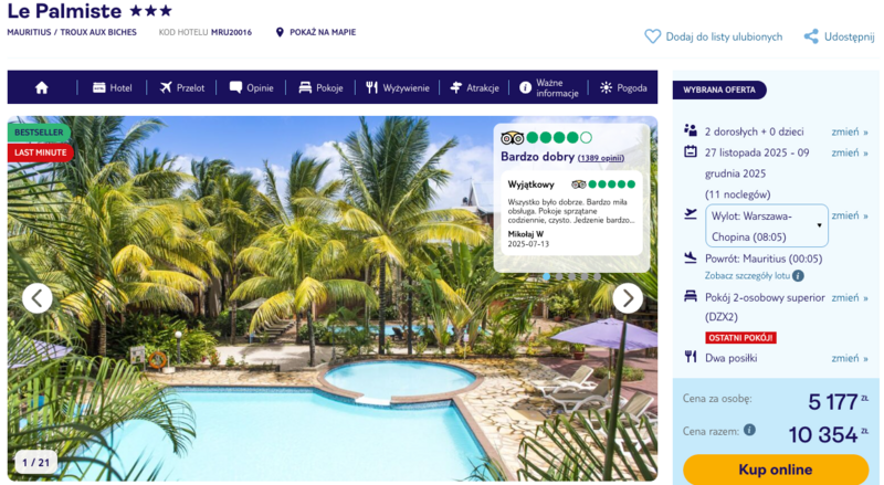 Podróż na Mauritius zaczyna się na lotnisku Chopina w Warszawie, a jej celem jest spokojny hotel Le Palmiste, położony w miejscowości Trou aux Biches. To miejsce, które przyciąga otoczeniem tropikalnej zieleni i spokojną atmosferą – idealne dla tych, którzy chcą odetchnąć od codziennego zgiełku i spędzić trochę czasu bliżej natury.