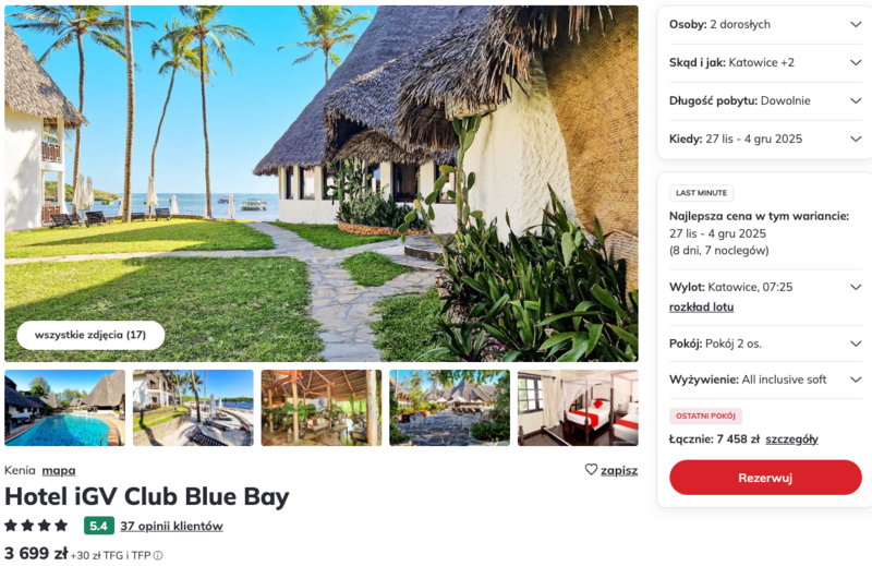 Wyloty z Katowic i Warszawy do Kenii to świetna okazja, by uciec od codzienności i spędzić czas w egzotycznym miejscu, gdzie przygoda spotyka się z błogim lenistwem. Wypad do 4-gwiazdkowego hotelu iGV Club Blue Bay z opcją all inclusive soft to propozycja idealna dla tych, którzy marzą o słońcu, plaży i chwili oddechu w wyjątkowym otoczeniu.