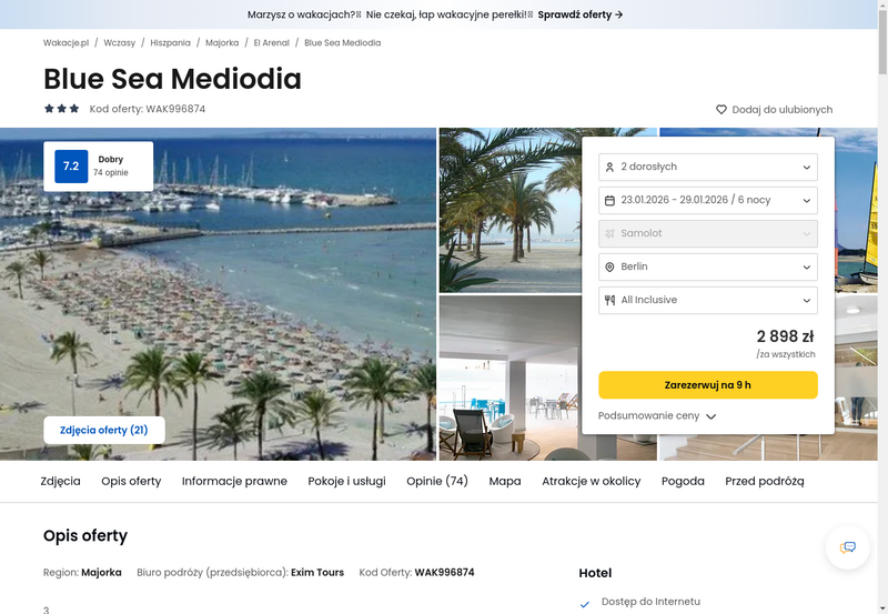 Aktualizacja: Ucieknij od zimy, ferie na Majorce: 3* hotel z all inclusive od 1389 zł