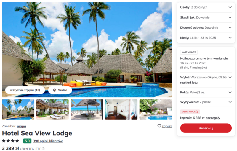 Cała oferta prezentuje się bardzo atrakcyjnie – wygodny hotel, świetna lokalizacja i niezapomniane widoki tworzą idealne warunki do relaksu. Sea View Lodge, z dala od tłumów turystów, pozwala w pełni nacieszyć się urokami Zanzibaru i naładować baterie w pięknym otoczeniu.