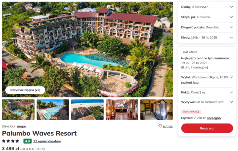 Wylot do Tanzanii z Warszawy. Tam, tuż przy jednej z rajskich plaż z białym, miękkim piaskiem, czeka na gości Palumbo Waves Resort – miejsce stworzone z myślą o relaksie i beztroskim wypoczynku.