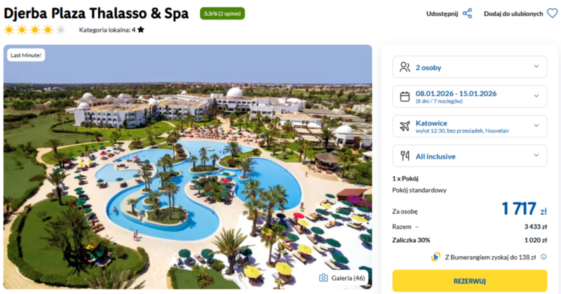 Na miejscu czeka Hotel Djerba Plaza Thalasso & Spa, który zbiera naprawdę dobre opinie. Goście szczególnie chwalą opcję all inclusive – można tu liczyć na spory wybór dań w restauracji głównej, a także ciekawsze smaki w opcjach a la carte. Smakosze nie będą rozczarowani, bo różnorodność potraw naprawdę robi wrażenie. Do tego dochodzi przyjazny klimat, kameralna atmosfera i obsługa, która sprawia, że pobyt staje się przyjemny i bezproblemowy.