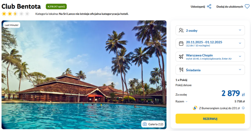 Kiedy trwa wyjazd, pogoda na Sri Lance po prostu dopisuje – około 29°C w dzień i tylko niewielkie opady. To świetna pora na plażowanie, kąpiele w oceanie, a także krótkie wypady po okolicznych atrakcjach. Końcówka roku to jeden z bardziej popularnych terminów na odwiedziny tego egzotycznego zakątka, więc jeśli marzysz o słońcu, kulturze i tropikalnych krajobrazach, warto się skusić.