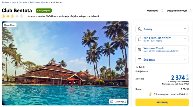 Kiedy trwa wyjazd, pogoda na Sri Lance po prostu dopisuje – około 29°C w dzień i tylko niewielkie opady. To świetna pora na plażowanie, kąpiele w oceanie, a także krótkie wypady po okolicznych atrakcjach. Końcówka roku to jeden z bardziej popularnych terminów na odwiedziny tego egzotycznego zakątka, więc jeśli marzysz o słońcu, kulturze i tropikalnych krajobrazach, warto się skusić.
