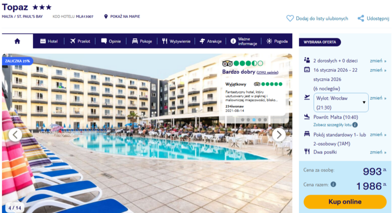 Wyloty na Maltę z Gdańska, Krakowa, Wrocławia lub Warszawy (Modlin). Celem podróży jest urokliwe nadmorskie St. Paul's Bay, gdzie na gości czeka hotel Topaz.