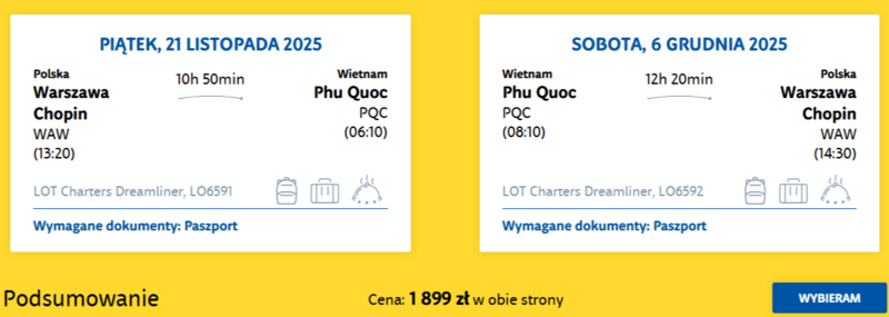 Wylot do Wietnamu zaplanowany jest z warszawskiego lotniska Chopina, co czyni podróż wyjątkowo wygodną dla osób wybierających się z centralnej Polski.