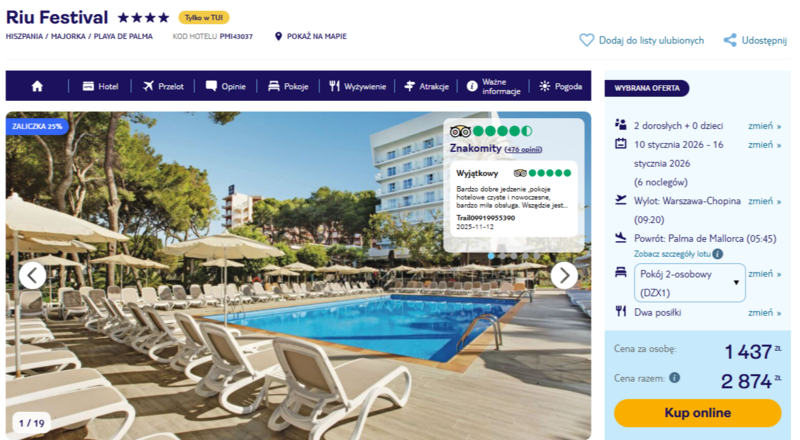 Na miejscu czeka Hotel Riu Festival – czterogwiazdkowy obiekt cieszący się uznaniem wśród podróżników. Goście doceniają przede wszystkim jego czystość, pomocną obsługę i świetną lokalizację. Plaża jest dosłownie kilka kroków dalej – dzieli ją tylko 250 metrów od hotelu. W okolicy nie brakuje restauracji i sklepów, więc na pewno nie będzie nudno. W samym hotelu również sporo się dzieje – można popływać w basenie lub wieczorem wybrać się na jedno z pokazów rozrywkowych.