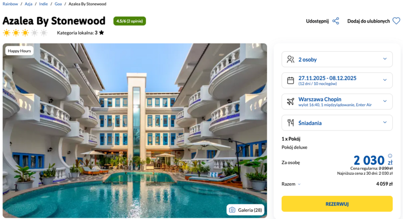 Wylot z Warszawy do indyjskiego Goa to świetna okazja, by oderwać się od codzienności i zanurzyć w egzotycznym klimacie. Hotel Azalea By Stonewood położony jest w cichej, kameralnej okolicy, zaledwie kilka minut spacerem od plaży Carmona. To idealne miejsce na spokojny wypoczynek i punkt startowy do odkrywania uroków południowego Goa.