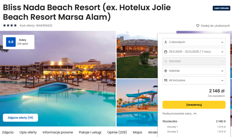 Wyloty z Gdańska i Warszawy to świetna okazja, by na własne oczy zobaczyć, czym zachwyca Egipt. Zakwaterowanie w czterogwiazdkowym hotelu Bliss Nada Beach Resort to propozycja dla tych, którzy chcą połączyć komfort z pięknym, morskim krajobrazem.