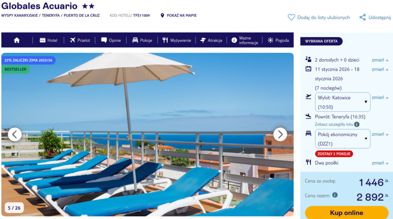 Zakwaterowanie zaplanowano w hotelu Globales Acuario, położonym w miejscowości Puerto de la Cruz. Do plaży Playa Jardin można dojść spacerem – to tylko około 1,5 km. W pobliżu czeka też kilka atrakcji, na przykład popularny park wodny Lago Martianez oddalony zaledwie o 2 km, co spodoba się tym, którzy nie lubią siedzieć w miejscu.