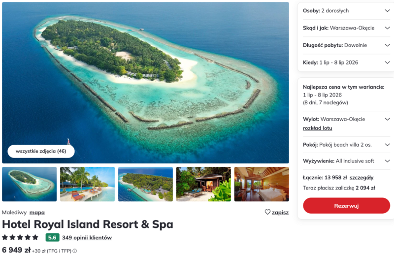 Choć Malediwy kojarzą się z luksusem, lipcowa (i nie tylko) oferta wygląda naprawdę atrakcyjnie. Ceny w tym rejonie bywają wysokie, ale za nimi często idzie jakość – dopieszczone usługi i niepowtarzalna atmosfera. Przykładem może być Royal Island Resort & Spa, gdzie można odpocząć w otoczeniu białego piasku i turkusowej laguny.