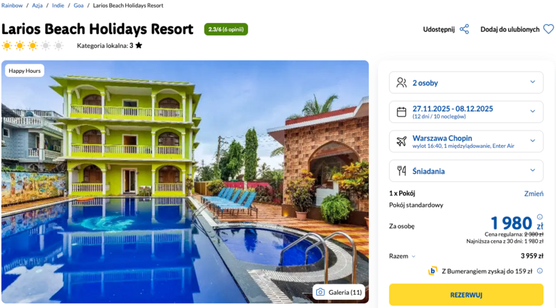 Na miejsce zakwaterowania wybrano hotel Larios Beach Holidays Resort. Szczególnie doceniana jest jego lokalizacja – tylko kilka kroków dzieli gości od popularnej plaży Baga Beach. To idealna baza wypadowa zarówno na leniwe dni na piasku, jak i wieczorne odkrywanie lokalnych atrakcji. Hotelowa restauracja serwuje dania kuchni azjatyckiej i kontynentalnej w formie bufetu, co pozwala każdemu znaleźć coś smacznego dla siebie.