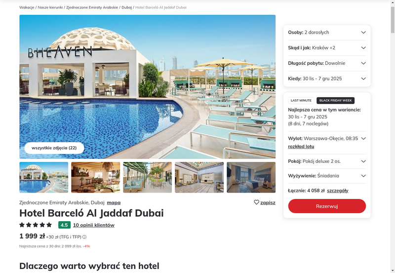 Oferta do Dubaju z pobytem w 5-gwiazdkowym hotelu wygląda naprawdę zachęcająco. Choć hotel nie znajduje się w samym centrum, jego położenie nie jest przeszkodą – zapewniony jest transport do głównych atrakcji i plaż. Dodatkowym atutem jest jakość serwisu i zadowolenie gości, które potwierdzają, że warto rozważyć ten kierunek na najbliższy wyjazd.