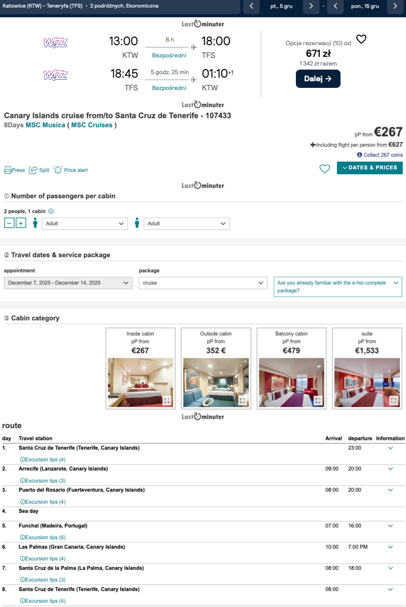 Trasa rejsu: Santa Cruz de Tenerife (Teneryfa) - Arrecife (Lanzarote) - Puerto del Rosario (Fuerteventura) - Funchal (Madera) - Las Palmas (Gran Canaria) - Santa Cruz de la Palma (La Palma) - Santa Cruz de Tenerife (Teneryfa).W cenie pełne wyżywienie, wybrane napoje do posiłków, opłaty portowe, podatki, obsługa bagażowa, wybrana rozrywka na pokładzie statku i napiwki dla obsługi. Cena nie zawiera ubezpieczenia oraz noclegów przed i po rejsie.