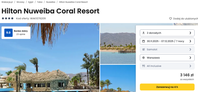 W ramach tej oferty możesz skorzystać z korzystnej ceny i spędzić urlop w komfortowym hotelu, takim jak TIME Coral Nuweiba Resort. To miejsce, które łączy wygodę z przyjemną urlopową atmosferą – idealne zarówno na aktywny wypoczynek, jak i na spokojne popołudnia przy basenie czy w cieniu palm.